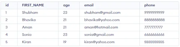 INSERT INTO Student (id, name, age, email, phone) VALUES (1, 'Amit', 20, '[email protected]', '9999999999'), (2, 'Rahul', 22, '[email protected]', '8888888888'), (3, 'Priya', 21, '[email protected]', '7777777777'), (4, 'Sonia', 23, '[email protected]', '6666666666'), (5, 'Kiran', 19, '[email protected]', '5555555555');>