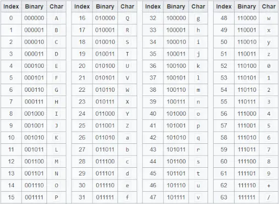 Zemāk redzamajā attēlā ir sniegta Base64 kodēšanas tabula.