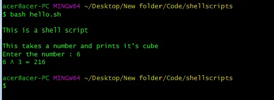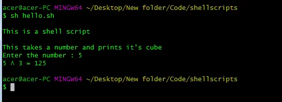 Šis ir standarta bash skripta izpildes veids. Ja izmantojat Windows, jums ir jābūt instalētai git bash. Operētājsistēmām Linux un macOS bash ir instalēts pēc noklusējuma. Šajā metodē mēs ierakstām bash, kam seko faila nosaukums ar paplašinājumu, t.i., šajā gadījumā sh. Terminālī palaidiet šādu kodu, aizstājot faila nosaukumu ar sava bash skripta faila nosaukumu.
