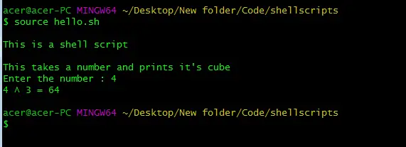 No palaitā skripta ekrānuzņēmuma mēs varam redzēt, ka avots darbojas tieši tāpat kā bash vai sh komanda. Iepriekš minētais skripts ir ļoti vienkāršs, taču tam nav nozīmes, kamēr skripts ir bez kļūdām un bez kļūdām. Šeit arī jāpievieno relatīvais ceļš, ja neatrodaties tajā pašā direktorijā, kur bash skripts.