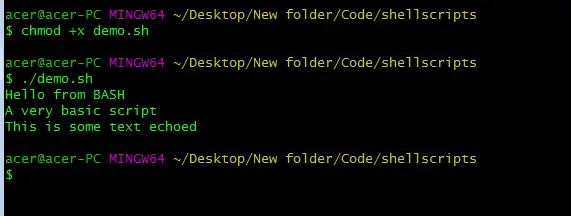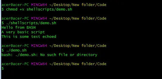 No iepriekš minētā piemēra mēs varējām palaist bash skriptu, izmantojot bash, kā arī komandu sh. Ja neatrodaties tajā pašā mapē/direktorijā, kur skripts, noteikti norādiet relatīvo ceļu uz skriptu.